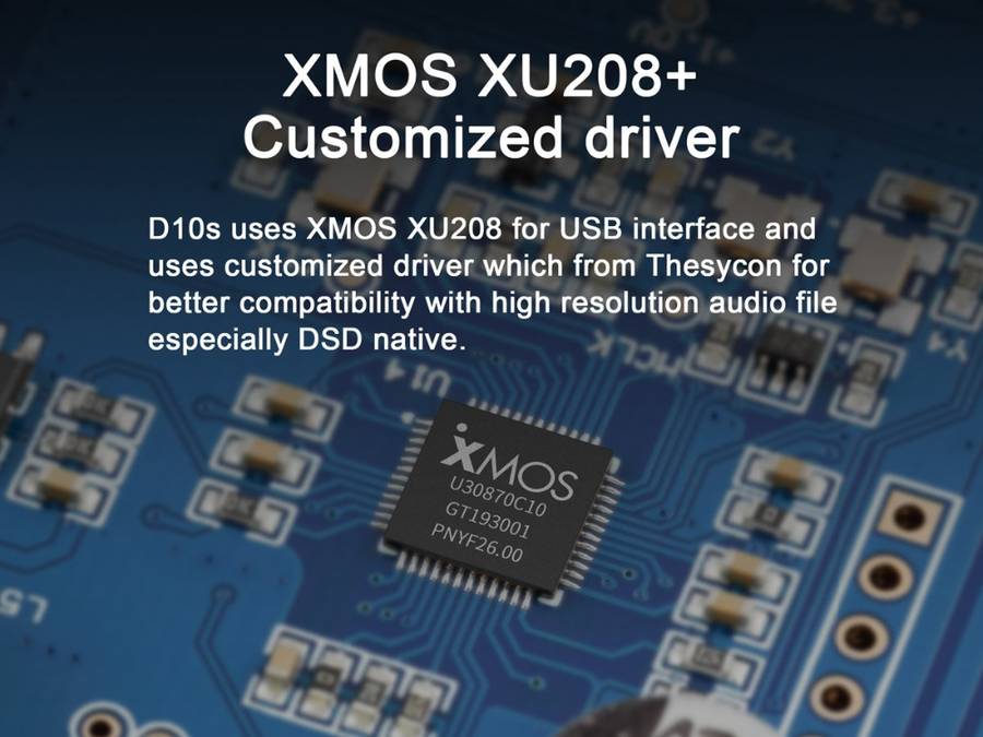 D10s uses XMOS XU208 for USB interface and uses customized driver which from Thesycon for better compatibility with high-resolution audio file especially DSD native