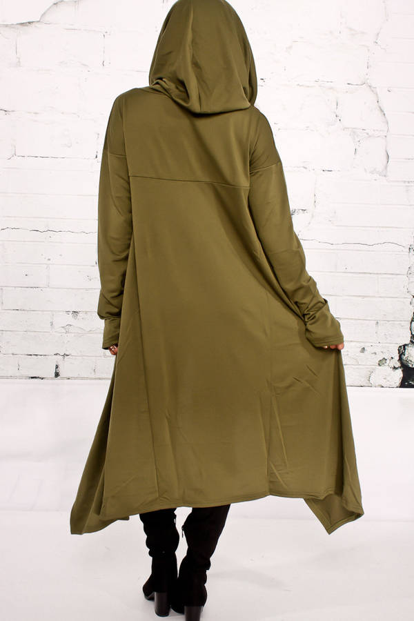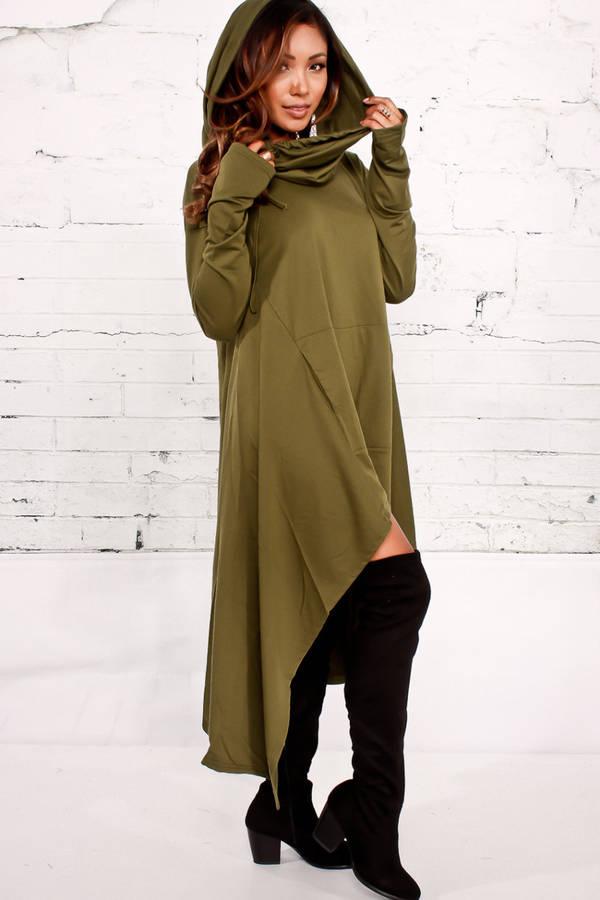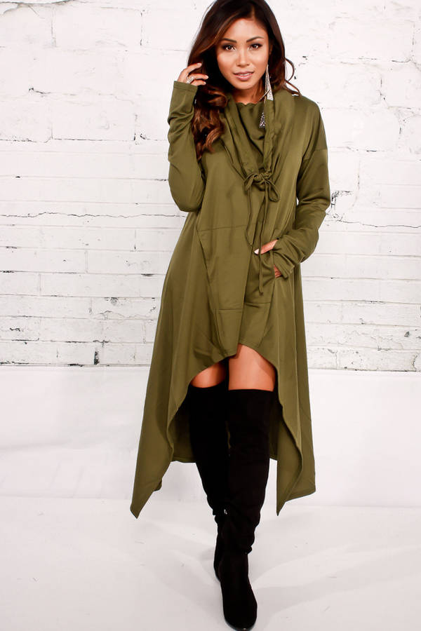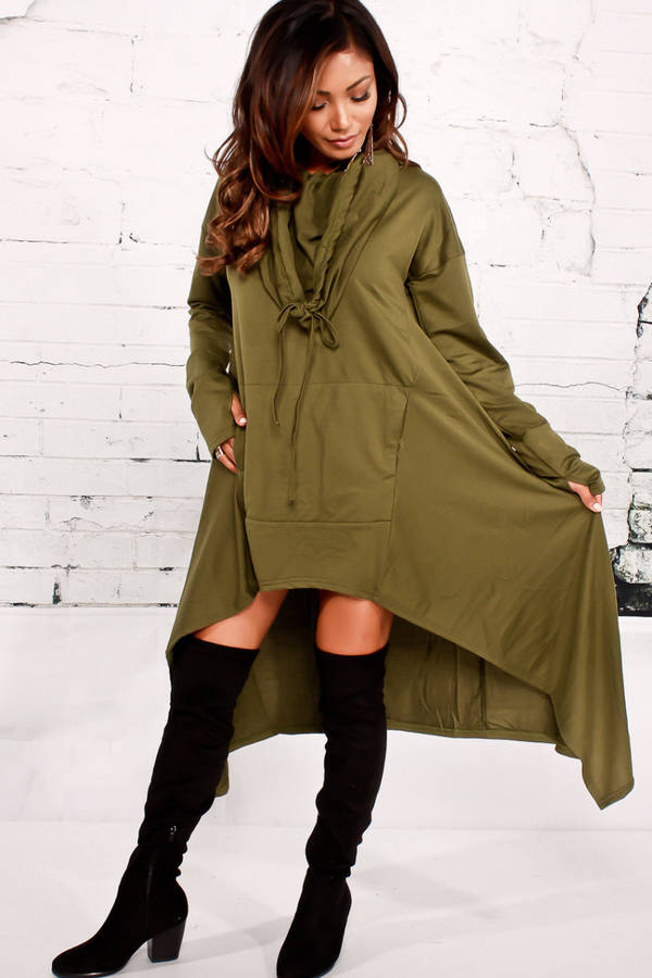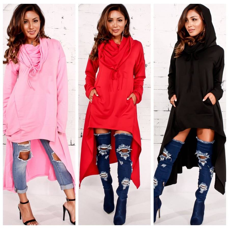 This hoodie features a cowl neckline, long sleeves, front pocket, duck tail style design.
