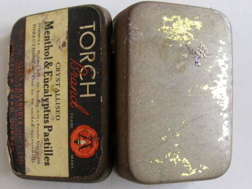 TORCH BRAND : MENTHOL & EUCALUPTUS PASTILLES : TIN - 7.9 X 5.5 X 2 cm : CONGELLA RD, DURBAN