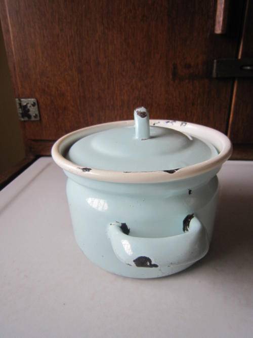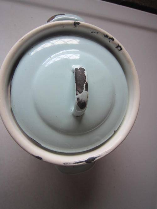 This little pot and lid has had a hard life and been used a lot but it could not resist this totally beautiful light blue and white enamel pot because the colour is so very unusual, I don't think it would be bought for use but with the lid on it looks fine and is so funky. It has a lot of chipping on the base on the inside and has chips on every surface. when I got it I soaked it for about 2 days and managed to get a lot of the old oil off it and it actually came up brilliantly, just a lovely item to have with your enamel collection.24cms L, 14cms H and 17cms W, postage 65.00.