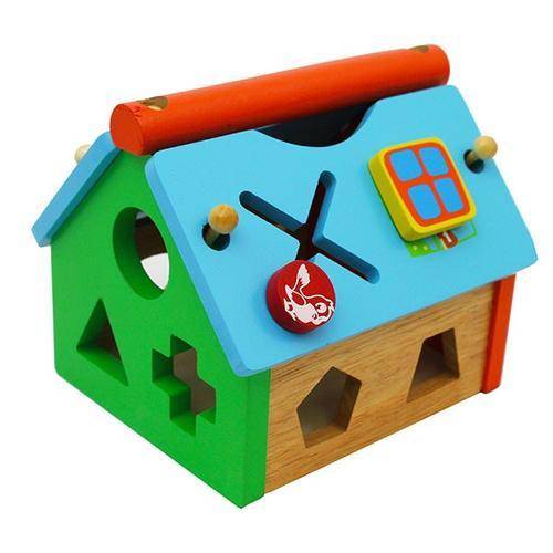 Wooden Clock House is a nice wooden block house for children aged 0 - 3, it can help develop: Observation of shape, colour, eye coordination, spatial orientation (left/right, above/below etc.) and also can help encourage learning object orientation