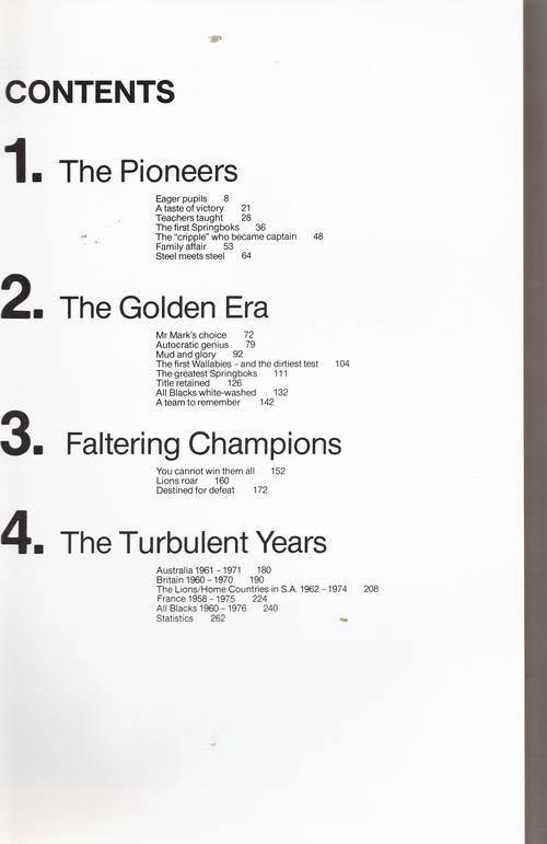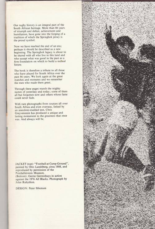 A tribute to those who played for the Boks over 86 years including a look at the great matches, moments and men who made them great. Includes some rare photographs linked by an anecdote-studded text and finished with SA Rugby Records from 1891 - 1976.