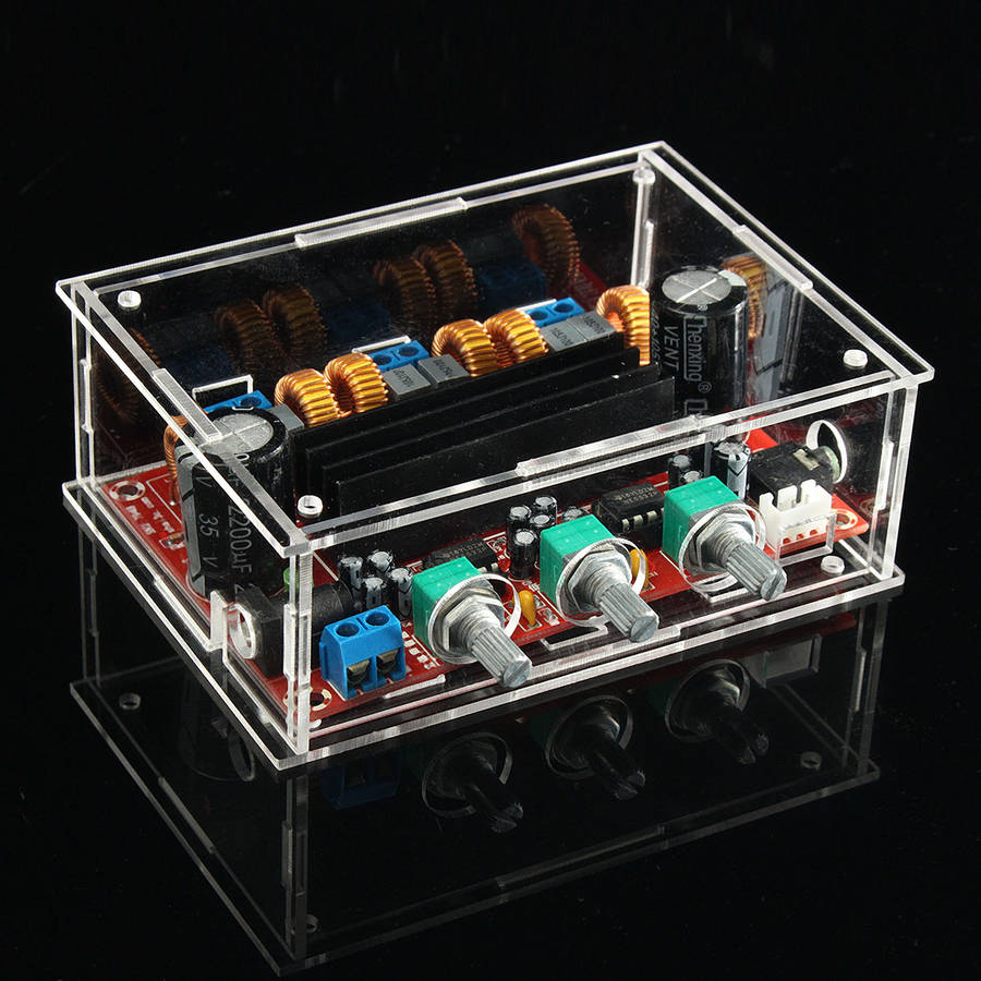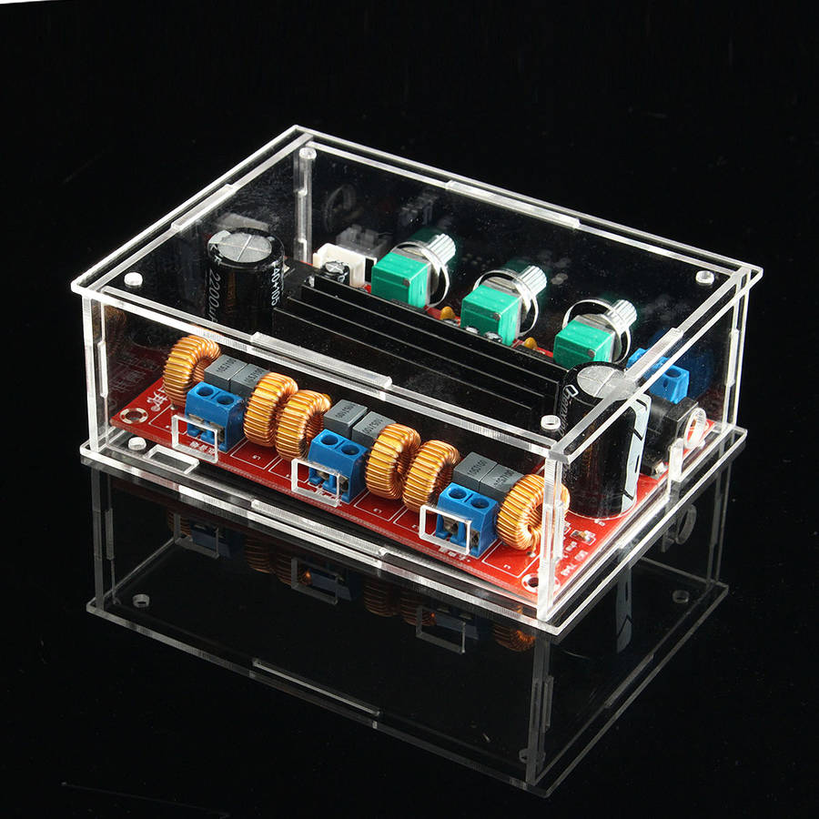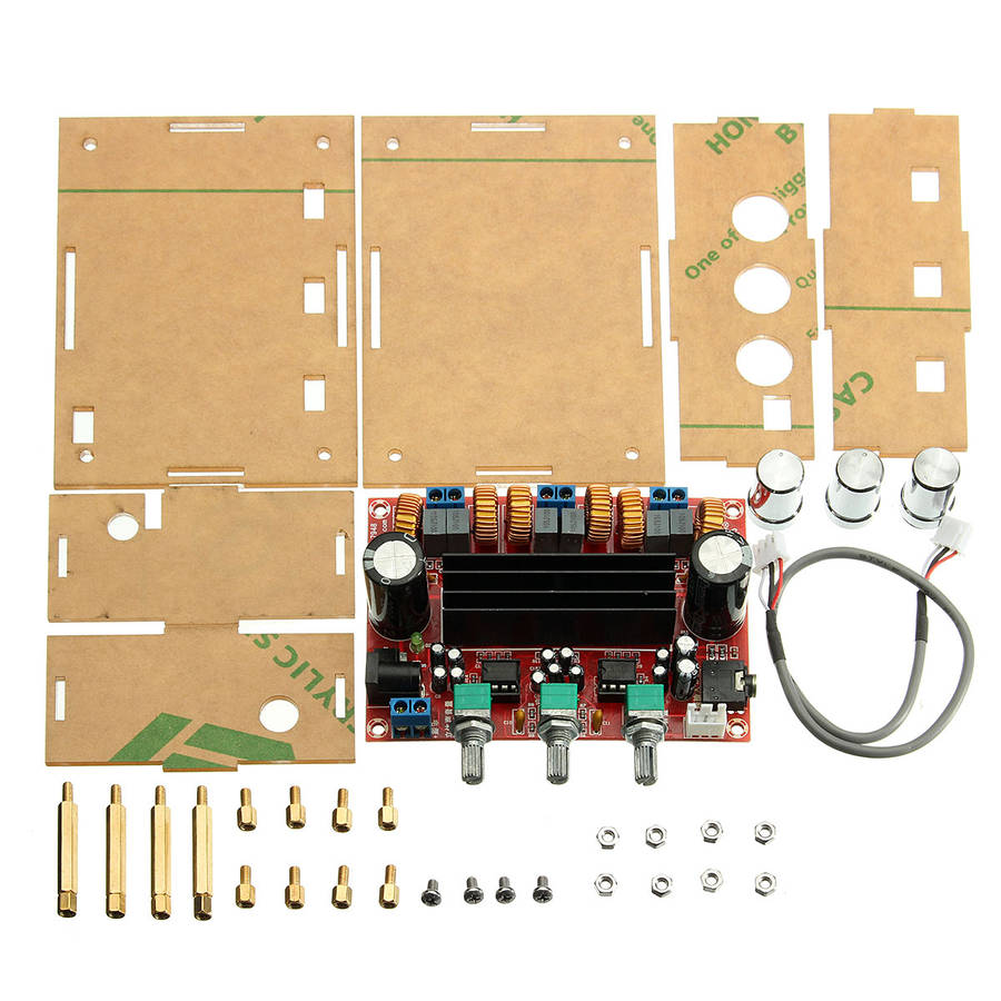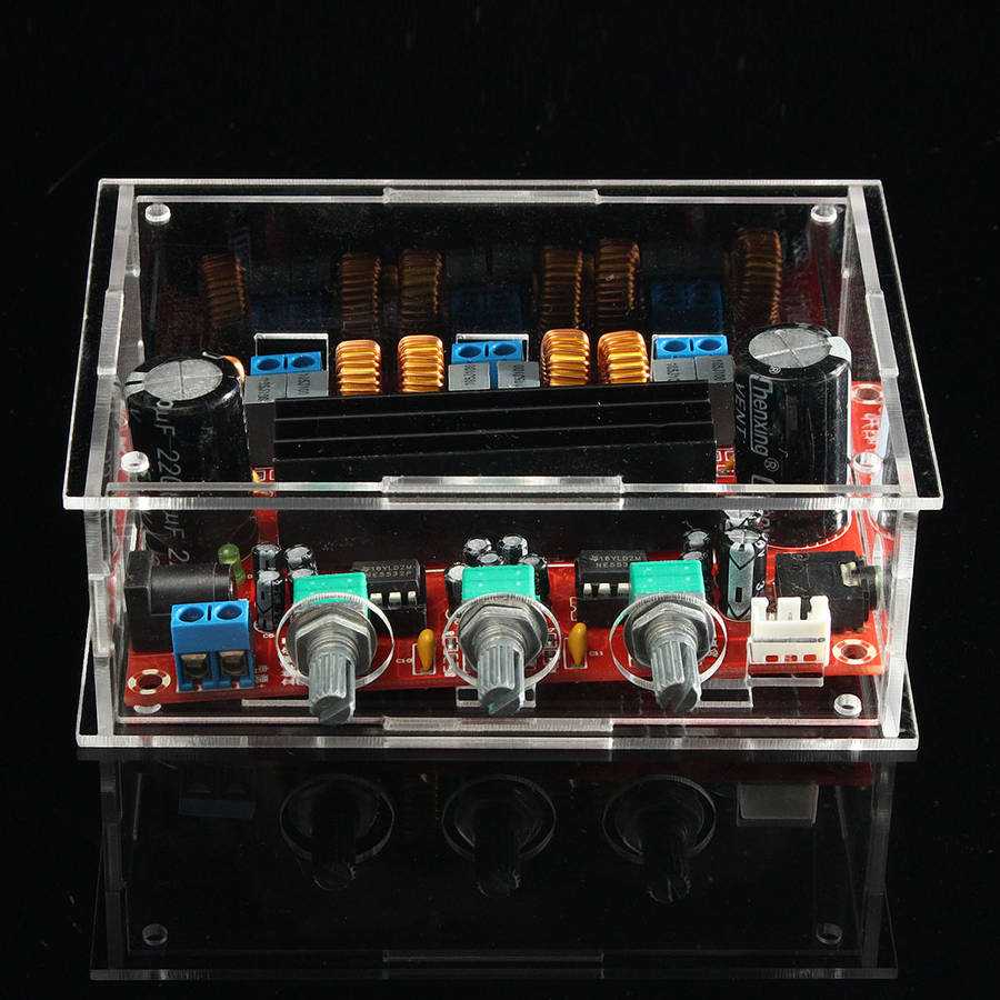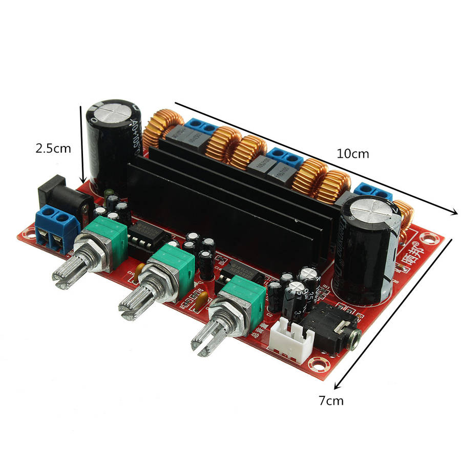 Supply voltage: DC 12-24V Chip: TPA3116x2 Channel type: 3 Channels (Left Channel, Right Channel, Subwoofer) Output power: 50Wx2 + 100Wx1 Subwoofer Output match: 4-8 ohm Audio output: Terminals Frequency response range: 14-100KHz SNR: 100dB Switching frequency: 1.2MHz Digital amplifier board: 10 x 7 x 2.5cm Case size: 11 x 8 x 3.5 (L*W*H)