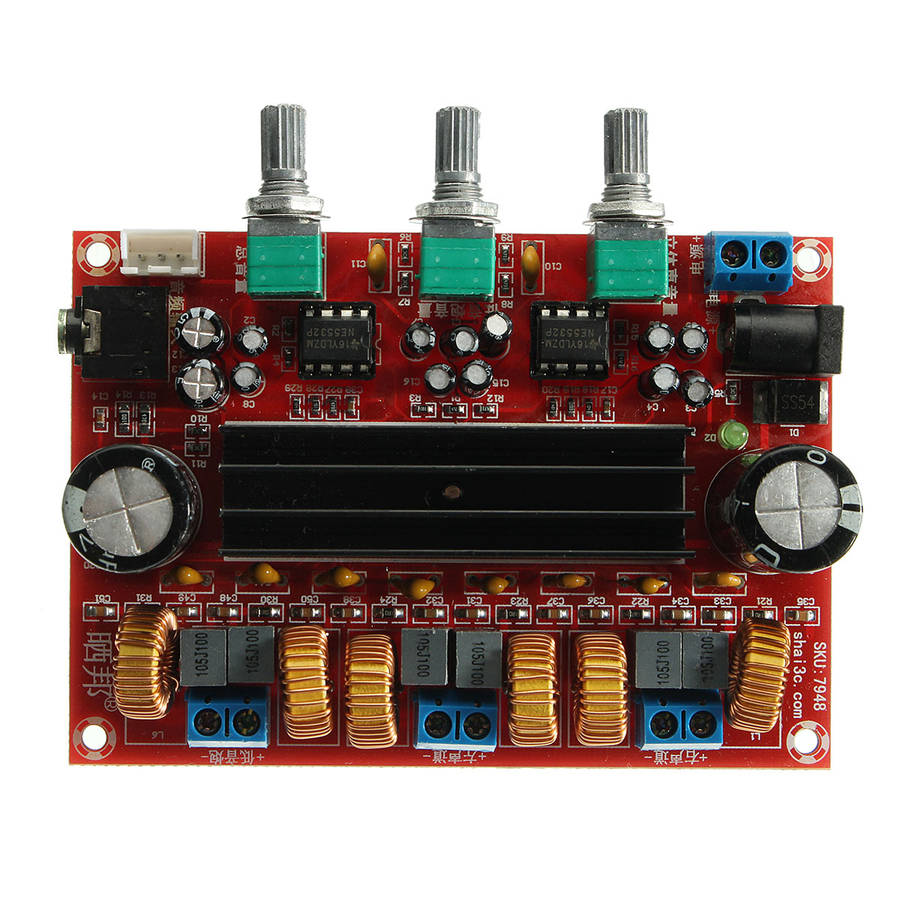 Adopts two high quality TPA3116D2 digital amplifier chips. Combined with nano-technology High frequency response density advantages Sound quality is very good, high efficiency and amplifying power. 50Wx2+100W 2.1 channels(left/right channel and subwoofer channel), high efficiency and low-heat. Powered by DC 12-24V, wide input voltage. Applicable speaker impedance: 4-8 ohm. Just connect the power supply and loudspeaker box, enjoy the pure digital music!