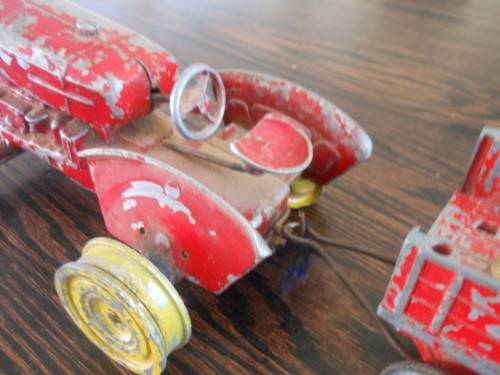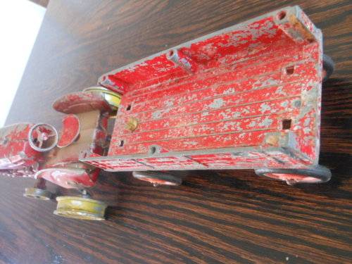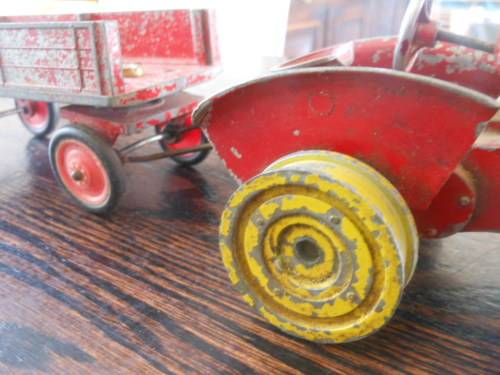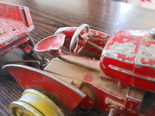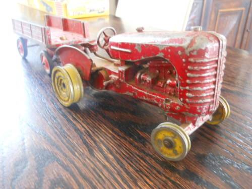 THIS IS A NICE TRACTOR FOR RESTORATION ,DONT KNOW THE MAKE. THINK THE SCALE IS 1/32 IT IS 30 CM LONG WITH TRAILER.