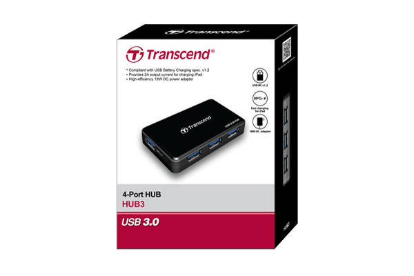 Transcend 4-port USB3.0 Hub - Black - Powered via USB port or power adapter (included) - Supports USB battery charging and fast charging for iPad