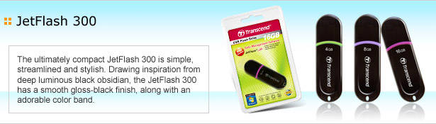 The ultimately compact TRANSCEND JetFlash 300 is simple, streamlined and stylish. It features a glossy outer case embellished with an adorable color band, and a bright LED indicator that flashes during data transfer activity. Moreover, weighing just 8.5g, the JetFlash 300 makes it easier than ever to carry as much data as possible anytime, anywhere.