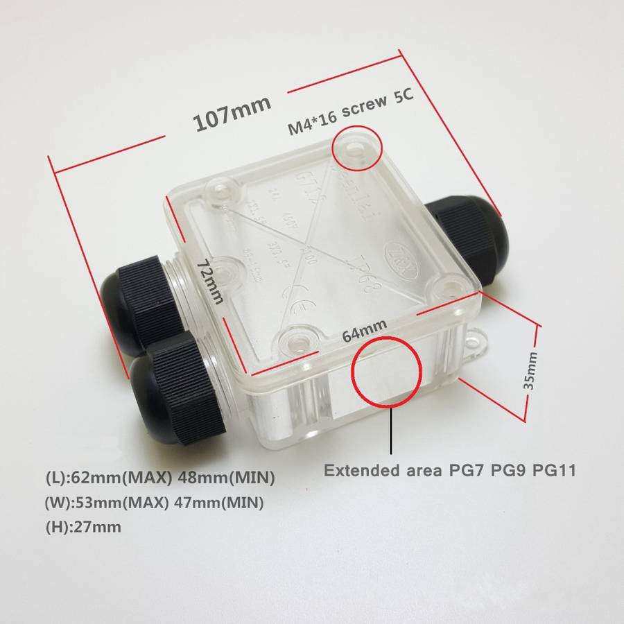 Specification: Type: IP68 Waterproof Junction Box Rated voltage450V Rated current24A Working temperature: -40a~105a Shell material: PC Dimension: 72*64*35mm