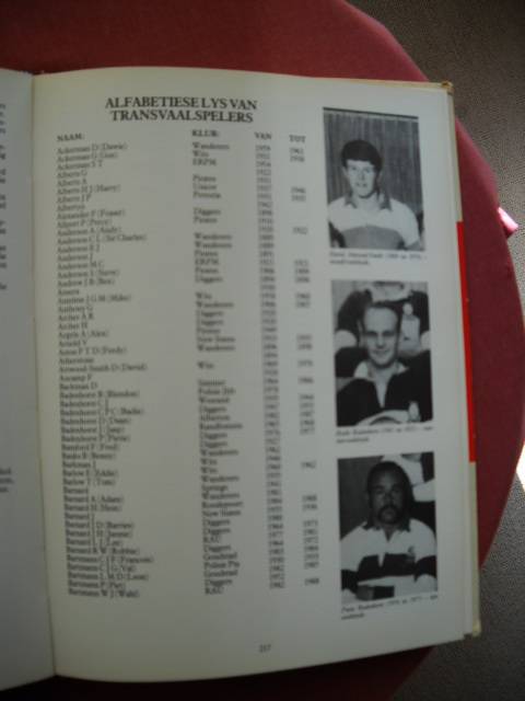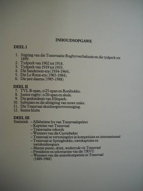 A4-grootte. Hardeband. Stewige binding. Binne is teks en foto's skoon. Eerste druk 1989 met 256 bladsye en geïllustreer met kleur- en s/w foto's. Die buiteblaaie is nie in goeie toestand nie. Die hoeke is gestamp, veral die voorste onderste hoek. Die rugkant het skade, ook aan bo- en onderkante. Voor in die boek is koerantuitknipsels met kleeflint geplak. Daar is ook iets met swart kokipen deurgehaal. Nietemin is dit 'n mooi aandenking van Transvaal Rugbyvoetbalunie se eerste 100 jaar. Daar is 'n inskripsie in ink op die boonste hoek van die titelblad. Posgeld in RSA = R60.00