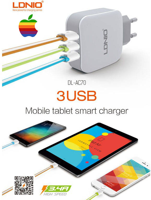 Features LDNIO DL-AC70 Single USB AC Adapter EU Plug for iPhone/iPad/ Electronic Products Sonic speed USB charging, high efficiency, safe and reliable USB port, convenient for you to use. Smart Mini Colourful Metal Frame Compatible with iPod,iPhone,iPad, smartphones etc. Input: 100~240V 50~60Hz Output: 5V 3.4A MAX for each USB Advanced plating edge technology, to increase its visual beauty. Exquisite workmanship, not damage equipment. Small, lightweight and ultra-thin flat charge does not occupy space. Smart compatible, designed for charging mobile phones and tablet PCs, digital products compatible with different devices