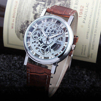 Trendy Men's Stainless Steel & Leather Skeleton Wrist Watch in Brown & Silver in Gift Box
