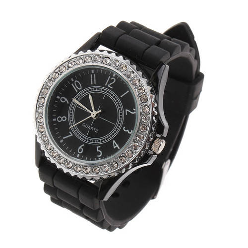 The watch is designed with soft silicone band and crystals around the case