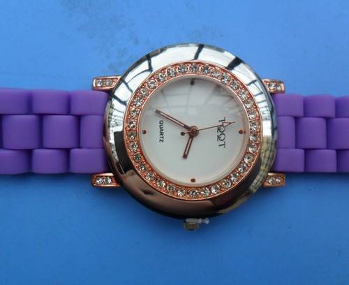 The watch is designed with soft silicone band and crystals around the case