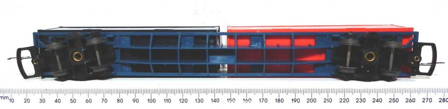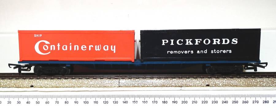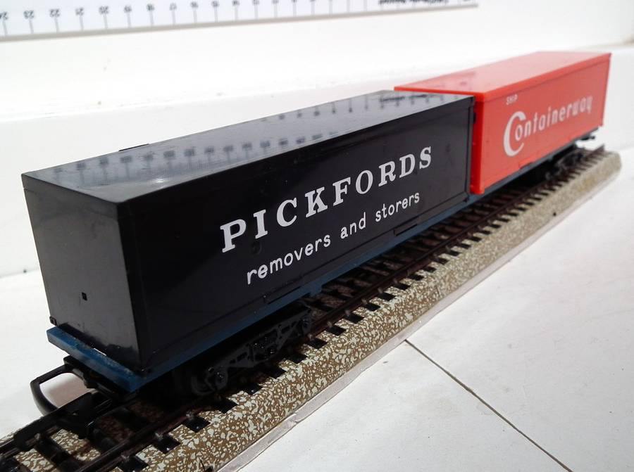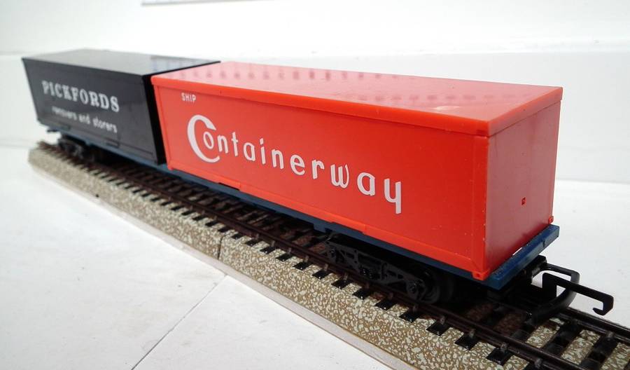 On auction is this plastic container carrier in good used condition for its age. The containers are glued to the car. It is fitted with Hornby couplings, double axil bogeys with metal\plastic wheel sets. Some corrosion on this model that was removed as far as possible and treated. All buffers intact. If you can use it, I give it to you at a good price? Please see photos for detail for it is part of the description. Contact me by email for enquiries.