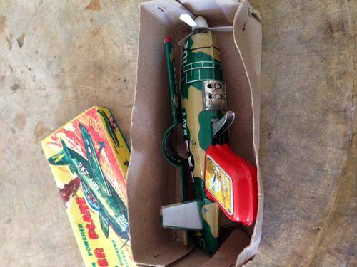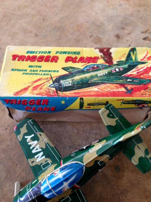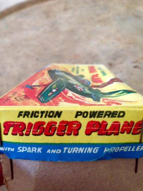 Rare friction powered tin Trigger Plane in great condition / fully functional with sparks and turning propellor