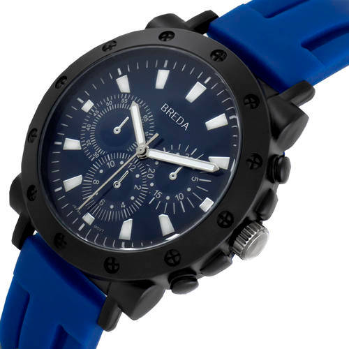 The "Tripp" watch by Breda is a sporty watch that is sure to leave a legacy. The oversized black tone bezel features bolt inspired texture, giving this watch a powerful feel. The dial is marked by white time markers and has white hour and minute hands with a silver second hand for easy timekeeping. The three non-working chronograph sub dials add luxury to your look. The "Tripp" watch sits securely on your wrist with a blue silicone band; wear this watch for virtually any occasion and feel confident in your style.