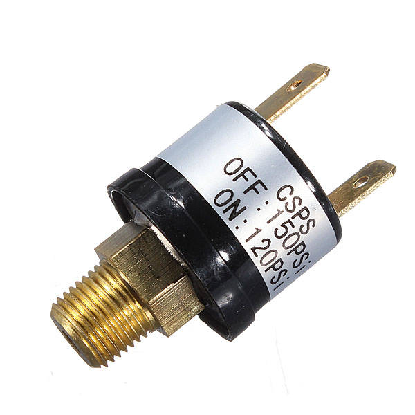 1.Rated 120/150 PSI. 2.This pressure switch is designed for high-pressure on-board air systems. 3.Ideal for air horns that require high air pressure. 4.Preset to turn on the compressor when tank pressure is below 120 psi, and turn off the compressor when the air tank pressure reached 150 psi,with a tolerance of±10%. 5.Can operate reliably up to 3.5 amps. 6.For 12 volt power source. 7.With 1/8inch male pipe thread,and 1/4inch push-on electric terminals.