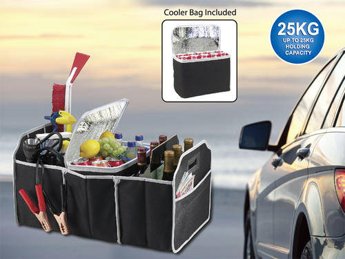 Three section collapsible trunk organizer with removable insulated cooler. Leak proof thermal shield insulated cooler keeps food and drinks at the perfect temperature.