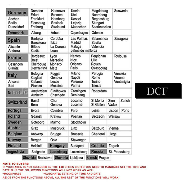 moonphase, day, date and time display. Radio-Controlled Clock is a clock that is synchronized by a time code bit stream transmitted by a radio transmitter connected to a time standard to provide accurate timing.