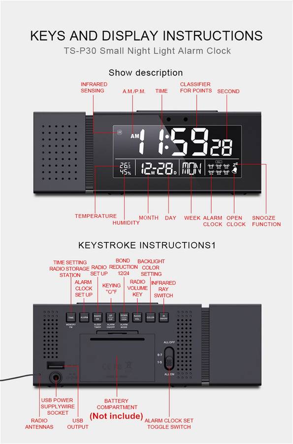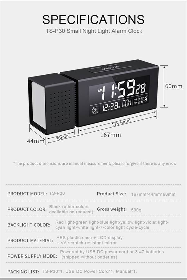 Specification: Model Number: TS-P30 Screen Type: LED Type: Digital Alarm Clock Shell material: Plastic Style: Modern Function: Snooze Function Form: Single Face Color: white, green, blue, black, pink Power supply mode: USB Size: 167mm*44mm*60mm(Length*Width*Height) Weight: 250 g Space: living room, bedroom, study room, dining room... Package included: 1 x Clock 1 x USB Cable 1 x manual