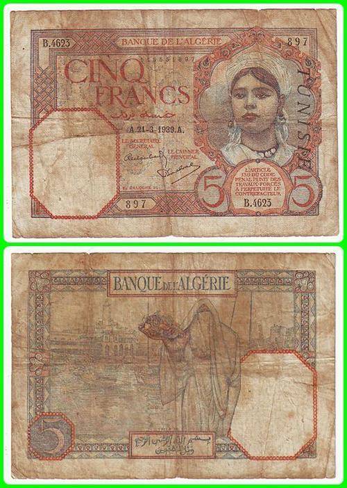 TUNISIA - 21.3.1939 - 5 FRANCS - PIC# 8 - VG NOTE - B.4623 897