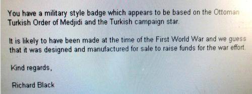 I could not find any information on this particular Turkish bagde on internet so emailed it to a military dealer in London. I got the following reply below.See all images for condition.