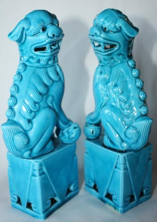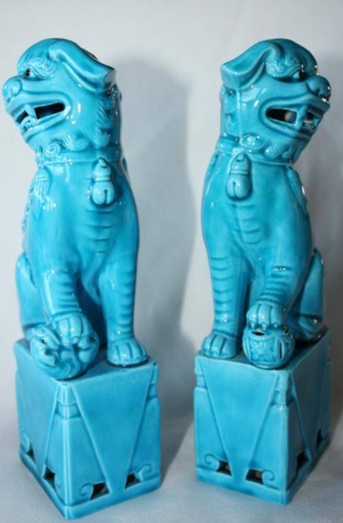 They are 19.5 cm in height and 7 cm in width. They are in good condition but please look at the foot of the on foo dog on the right, some paint damage (which probably occured when they were fired). No markings of inscriptions.