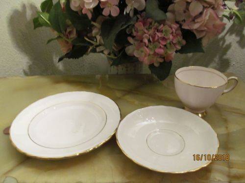 THE HARLEQUIN SERIES MANUFACTURED BY R.H & S.L WAS RELEASED IN 1947 AND RETAILED IN THE INDIVIDUAL COLORS WHICH INCLUDED HARLEQUIN WHITE, PINK, BLUE, GREEN AND YELLOW. THIS GORGEOUS FINE PORCELAIN TEA TRIO IS THE HARLEQUIN WHITE. THE TEACUP HAS A GOLD COVERED PEDESTAL BASE WHILE THE SCALLOPED RIMS OF ALL THREE ITEMS ARE PROMINENTLY DECORATED IN GOLD TRIM
