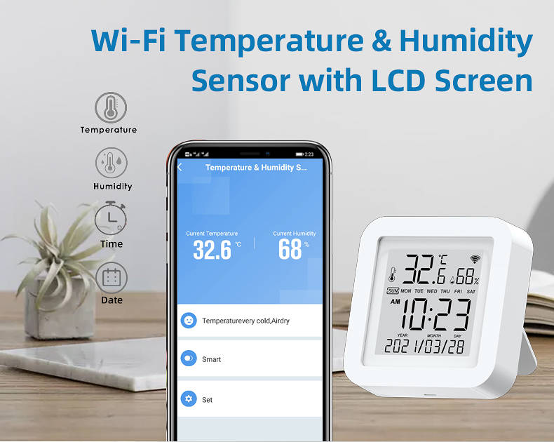 Description : Tuya WIFI Temperature Humidity Smart Sensor Clock Digital Display Remote Control Thermometer Support Alexa Google Assistant Features : - High Precision The sensor uses top suppliers. It can guarantee the high precision of the measurement data. - Real-time Monitoring and Recording The sensor uses USB power supply. Compared with the battery version, the sensor will monitor the temperature and humidity in real time. The sensor will report when the temperature and humidity changes very little. You can view the changes in the value on the APP or display screen. Record the temperature and humidity changes on the APP, and use the graphics to show you. - LCD Screen Display The sensor uses LCD as the display of temperature and humidity, and the display of time and date is added on the screen. Time and date are automatically calibrated. - Scene Linkage The sensor can be used as the temperature and humidity data source of Tuya Smart, Smart Life, Amazon Alexa, Google Home. You can do many automated processes based on the data source. - Temperature Unit Switch The sensor is designed with a temperature display conversion function of Celsius and Fahrenheit. You can choose the unit that needs to be displayed according to your needs. - Third-party Voice Support The sensor supports Amazon Alexa, Google Home Asistant. You can check the current temperature and humidity by voice. Specifications :