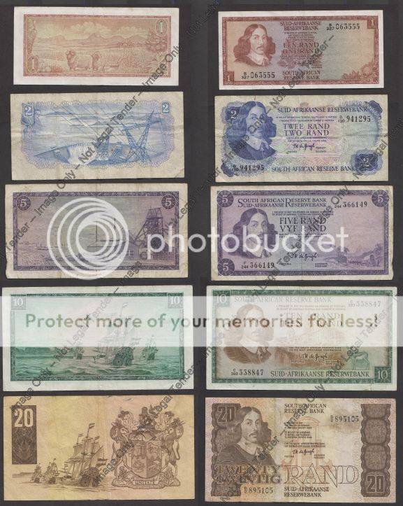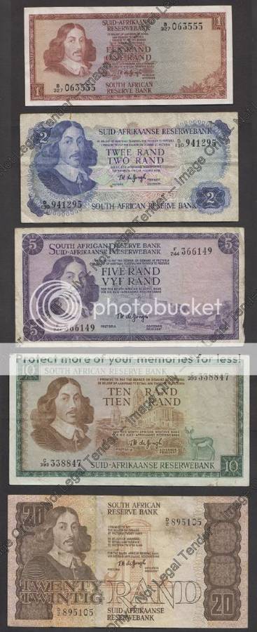 Please note that these are not new notes but circulated (used) notes and the R20 has a stain mark. These notes were issued during the 1970s