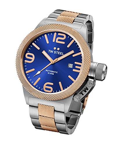 TW Steel CB146 Canteen Automatic men's watch features a 50mm wide and 14mm thick two tone rose gold ion plated solid stainless steel case with a fixed textured hammered bezel and textured cap covered hook protected push-pull crown. TW Steel CB146 is powered by an accurate Seiko NH35 automatic movement with 24 jewels. This stylish watch also features a shiny sunray blue dial with white accents rose gold tone luminous hands and hour markers along with the date display function; scratch resistant sapphire coated reinforced mineral and water resistant to 100 meters. TW Steel CB146 is equipped with a 24mm wide two tone rose gold ion plated solid stainless steel bracelet with a fold over push button safety lock clasp. TW Steel CB146 men's Canteen Bracelet automatic blue dial two tone rose gold steel watch is brand new and comes in an original TW Steel gift box and is backed by a 2 year store limited warranty.