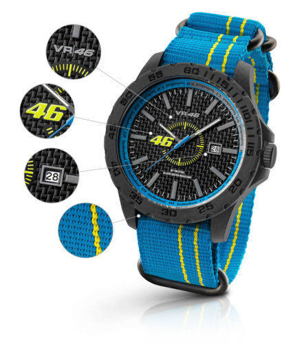 VR|46 and TW Steel, the perfect combination in a Sports Watch. Model VR9 has a lightweight Carbon Case diameter of 45mm and features a nylon strap with a black dial.