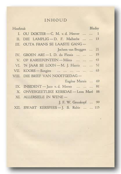 Twaalf Afrikaanse Kortverhale versamel deur Sarel Marais (6e 1957). A5, hardeband met stofomslag, 124 bls. Stofomslag verweer. Boek binne in leesbare toestand. Ligte waterskade.