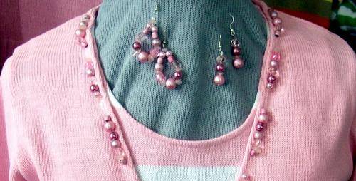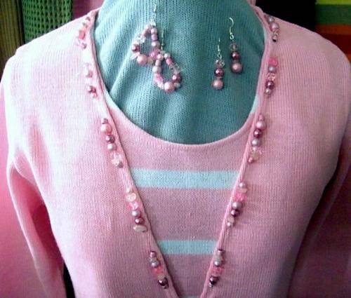 ALL BEADS HAVE BEEN SEWN ONTO GARMENT = BEADING AND EARINGS ARE MADE FROM ALL GLASS , PITTED PEARL PINK AND WHITE, FACETED PINK AND LILAC, SPLASHED PINK GLASS, SQUARE PINK CLEARS AND CHIPS OF SEMI PRECIOUS ROSE QUARTZ.