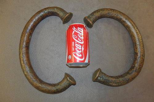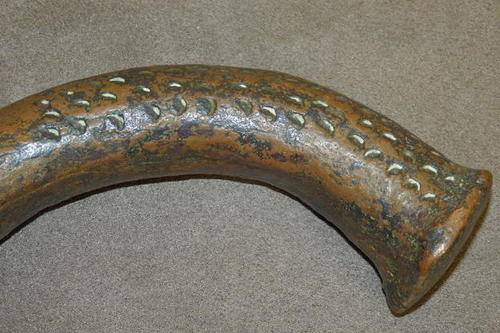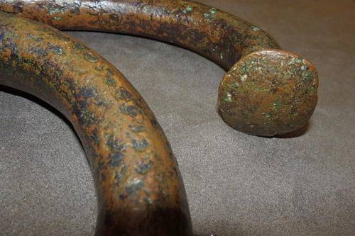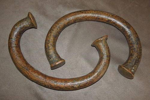 THESE TWO AMAZING AND RARE (LARGE) WEST AFRICAN SOLID BRONZE "KING MANILLA" CURRENCY BRACELETS EACH MEASURE ROUGHLY 26cm LONG x 18cm HIGH. THESE ARE COMMONLY KNOWN AS KING "MANILLA" BRACELETS DUE TO THEIR SIZE, WITH "BRACELET" HAVING NO RELEVANCE TO THEM BEING WORN. THE BRACELETS ORIGINATED IN PRE-COLONIAL DAYS AND WENT ON TO BE USED AS TRADE CURRENCY THROUGHOUT THE COLONIZATION OF WEST AFRICA AND HAS A PROFOUND IMPACT IN THE SLAVE TRADE MARKET. THE BRACELETS RANGE IN SIZE FROM BRACELET SIZE CURRENCY TO THE LARGER 10 INCH BRACELETS SUCH AS THESE TWO. THE COMBINED WEIGHT OF THE TWO BRACELETS IS 4.960kg. THE VALUE WAS ALSO DETERMINED BY THE METAL USED AND COPPER "RED GOLD" AND BRONZE WERE MOSTLY USED. THE ENGRAVINGS ON THE BRACELETS WERE ALO A DETERMINING FACTOR FOR THEIR WORTH. PLEASE HAVE A LOOK AT THE THREE LINKS BELOW FOR SOME INTERESTING FACT ABOUT MANILLA CURRENCY, INCLUDING THE VARIOUS TYPES OF MANILLA CURRENCY USED THROUGHOUT AFRICA.