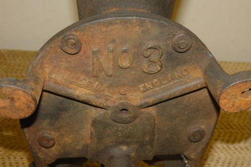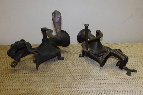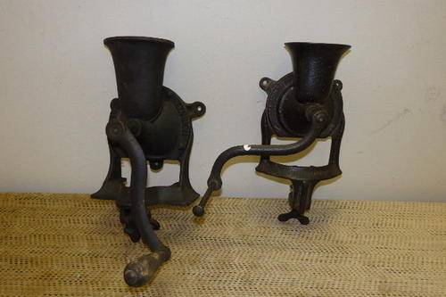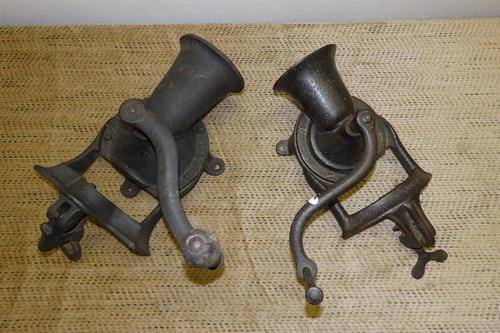 THESE TWO AMAZING AND VERY RARE COFFEE GRINDERS INCLUDE A VINTAGE WOODEN HANDLED SPONG No. 3 (31cm LONG x 17cm WIDE) AND AN ANTIQUE (LATE 1800's) VICTORIAN ERA LOVELOCK NO. 2 COFFEE GRINDER WHICH WAS MADE BY JF LOVELOCK OF LONDON, ENGLAND AND MEASURES 25.5cm LONG. THE NUMBER "2" COFFEE GRINDER IS ONE OF THE RARER LOVELOCK COFFEE GRINDERS. THE COMPANY WAS KNOWN FOR MANUFACTURING MINCES, GRINDERS AND THE LIKES. THIS WOULD MAKE A SPECTACULAR PIECE FOR A VICTORIAN OR FARM STYLE KITCHEN. THE GRINDERS ARE ORNAMENTS.