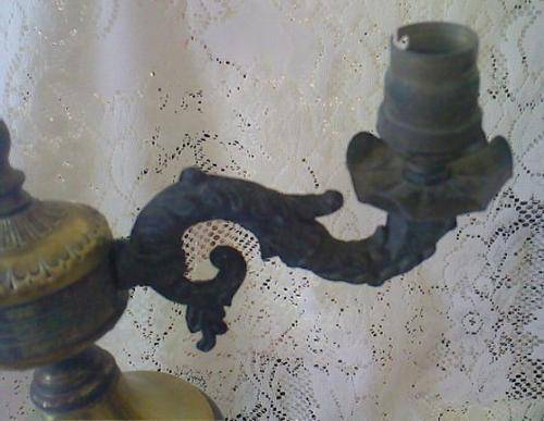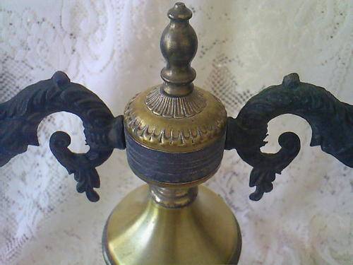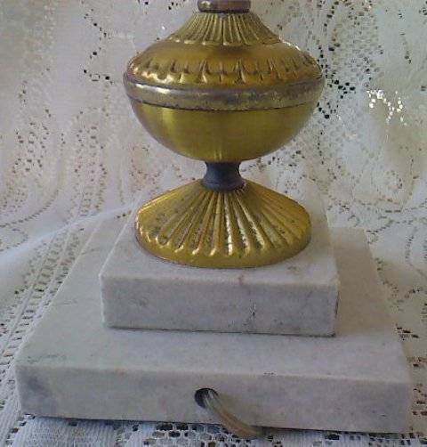 Beautiful tall two-arm lamp mounted on a double marble base. The arms seem to be pewter. The body of the lamp is mostly a brass-coloured metal, with brass rings and knobs. The arms and lightfittings need to be tightened. I have not cleaned this item, so it can do with a thorough cleaning. There is a bit of tarnish but overall in a beautiful condition. Measures 43cm in height and weighs just over 1.9kg. The bottom marble base is felt-lined, and measures 12.75x12.75cm.