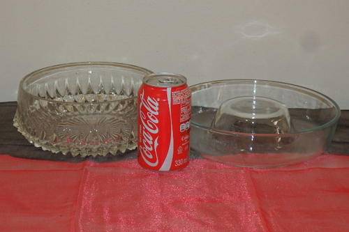 THESE TWO AWESOME GLASS BOWLS INCLUDE AN ORIGINAL FRENCH MADE "PYREX" MOUSSE MOLD AND AN ORNATE KITCHEN MIXING/ SERVING BOWL. THE MOUSSE MOLD IS 22cm ACROSS AND PERFECT FOR DESSERTS SUCH AS CHOCOLATE MOUSSE OR FLAMBY ETC. AND IS PERFECT FOR COLD TERRINES OR MOUSSES. THERE ARE NO CHIPS OR CRACKS IN ANY OF THE BOWLS. THE MIXING BOWL IS 20.5cm ACROSS x 8cm HIGH.