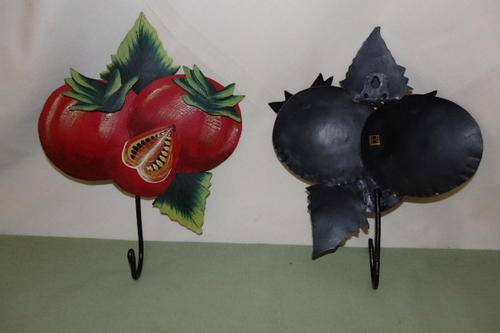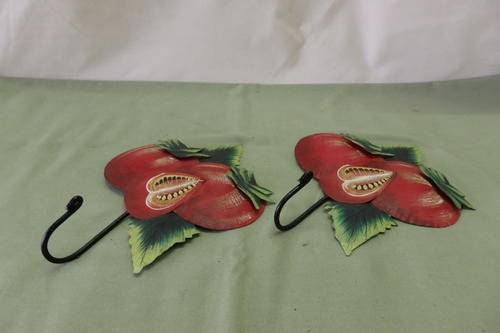 THESE TWO AWESOME HANDMADE AND HAND PAINTED (INDIAN MADE) COLOURFUL WALL MOUNTABLE COAT HANGERS EACH MEASURE ROUGHLY 21.5cm x 16.5cm ACROSS. THESE COAT HANGERS WOULD ALSO BE PERFECT IN THE KITCHEN FOR DISH TOWELS OR APRONS ETC OR AT THE DOOR FOR RAIN COATS. THERE IS MINIMAL WEAR AND TEAR.