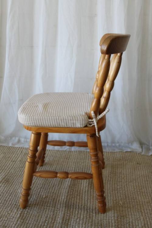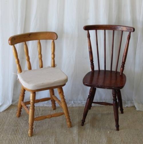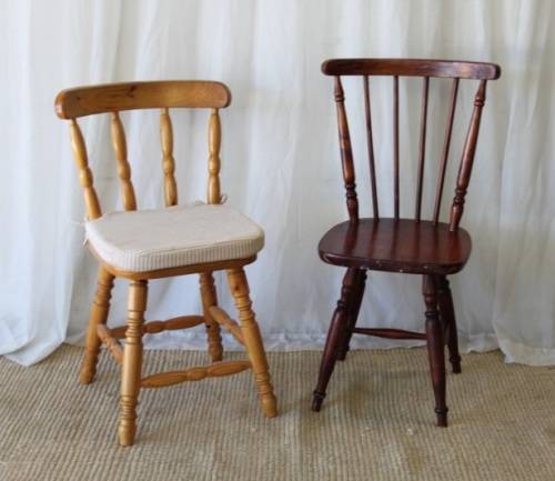 THESE TWO AWESOME WOODEN OCCASIONAL CHAIRS WITH TURNED LEGS AND TURNED BACKREST SUPPORTS ARE PERFECT FOR MIX AND MATCH CHAIRS AT A DINING TABLE AND MEASURE AS FOLLOWS: THE LIGHT PINE STAINED CHAIR IS 800mm HIGH x 470mm LONG x 450mm WIDE AND THE DARK STAINED PINE CHAIR IS 870mm HIGH x 470mm LONG x 430mm WIDE. THE DARK CHAIR HAS HAS A REPAIR ON THE ONE CROSS STRUT. PLEASE VIEW THE PICTURES CAREFULLY TO FULLY APPRECIATE THESE AWESOME OCCASIONAL CHAIRS AND TO CONFIRM THE CONDITION.
