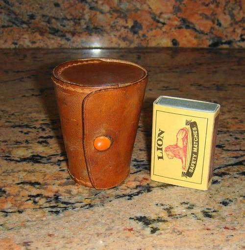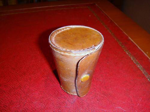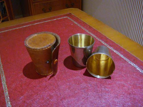 I don't know much about this, its origin, who would have used it, or anything. I just like it and it fascinates me, apart from being very useful. It is very old but in good condition apart from the button being a bit loose. Beakers are 55cm high so must have been meant for Brandy or Port maybe, the leather case 65cm high . Please look at my other items.