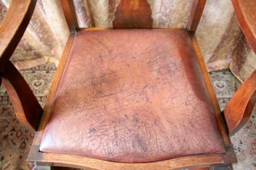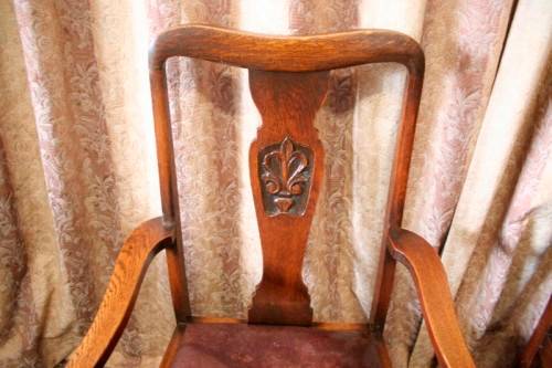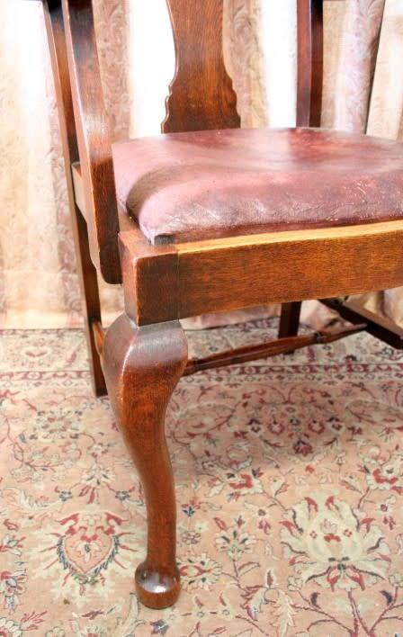 These very well made and beautiful carved vintage Oak Queen Anne styled leg dining chairs/ carvers would look great with a dining table or even out on a patio. The chairs are in good condition with some/ normal age and usage related wear and tear as seen in the pics. The leather on the seats have some wear on them (please see pics) one could easily re do the upholstery. The chairs each measures 52cm x 62cm x 107cm high. These are solid quality chairs! Please view the pics carefully to confirm the condition of the chairs and to fully appreciate them.