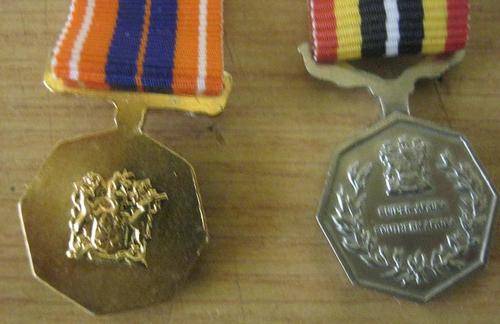 These two miniature medals with ribbons are the Southern Africa medal and the Pro Patria medal