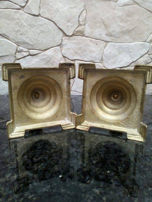 A pair of brass candlesticks. Standing on a 9.5 x 9.5cm square base and 23cm high, weighing 293g each.