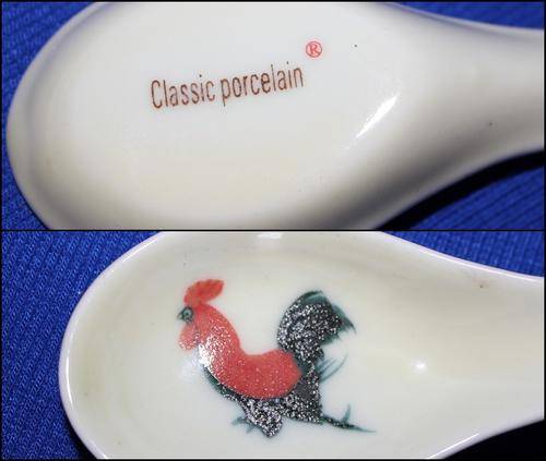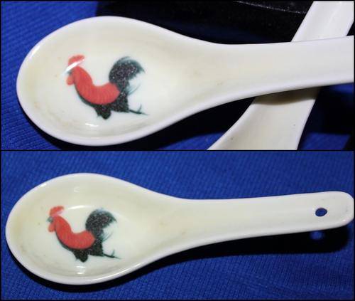TWO CLASSIC PORCELAIN ORIENTAL SPOONS DECORATED WITH A ROOSTER
