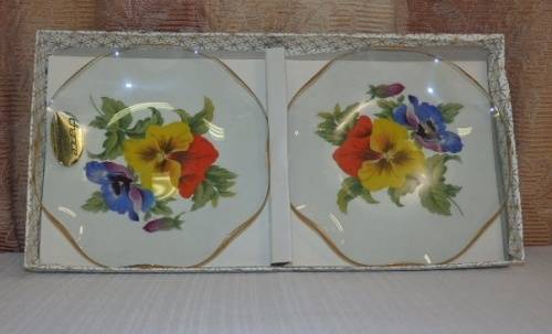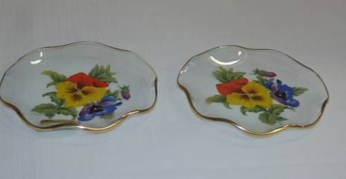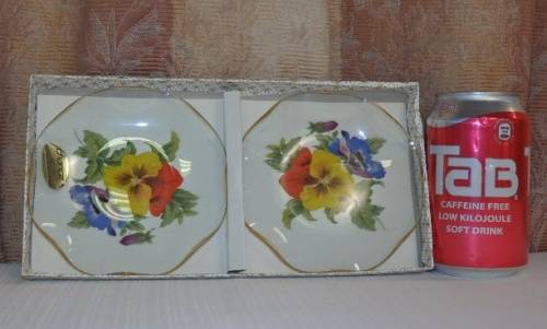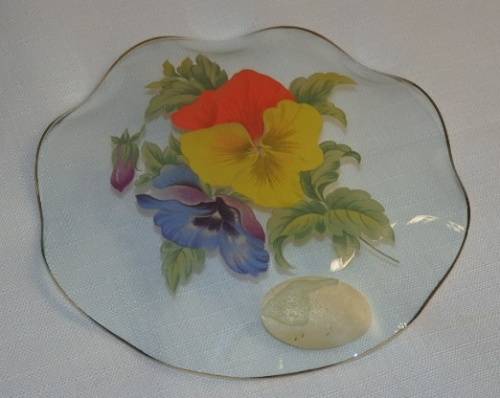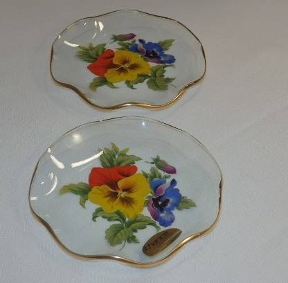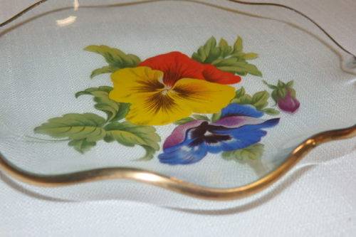 THESE TWO ELEGANT VINTAGE 'CHANCE OF ENGLAND' HAND PAINTED GLASS GEM PLATES WITH CONVOLUTED EDGES MEASURE 12.5cm ACROSS. THESE AWESOME VINTAGE GEM PLATES HAVE NEVER BEEN USED AND ARE IN THEIR ORIGINAL PRESENTATION BOX. THE BRIGHTLY COLOURED HAND PAINTED PANSY FLOWERS MAKE THEM VERY PRETTY PLATES. THERE ARE ABSOLUTELY NO CHIPS OR CRACKS IN THE GLASSWARE. THEY WOULD LOOK STUNNING ON A LADIES DRESSING TABLE AS GEM PLATES OR WOULD BE PERFECT FOR SERVING AFTER DINNER SWEETS. PLEASE VIEW THE PICS CAREFULLY TO FULLY APPRECIATE THESE BEAUTIFUL HAND PAINTED GEM PLATES AND TO CONFIRM THE CONDITION.
