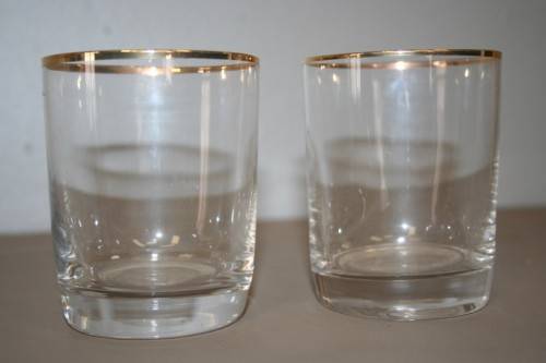 THESE TWO AWESOME AND STYLISH DRINKING GLASSES WITH GOLD RIMS ARE IN GREAT CONDITION WITH NO CRACKS OR CHIPS IN THEM. THESE GORGEOUS GLASSES WOULD BE GREAT FOR COOL DRINK OR EVEN ON A BREAKFAST TRAY WITH JUICE. PLEASE VIEW THE PICS CAREFULLY TO FULLY APPRECIATE THESE TWO WONDERFUL DRINKING GLASSES AND TO CONFIRM THE CONDITION.