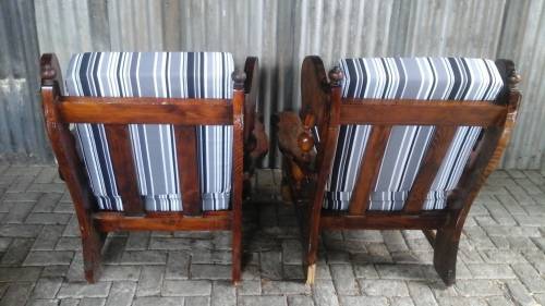 THE FRAME OF THESE FANTASTIC CHAIRS ARE SOLID WOOD AND IS COMPLIMENTED WITH COMFORATBLE GREY AND WHITE FABRIC CUSHIONS.