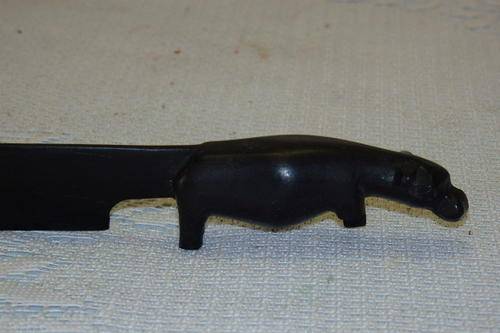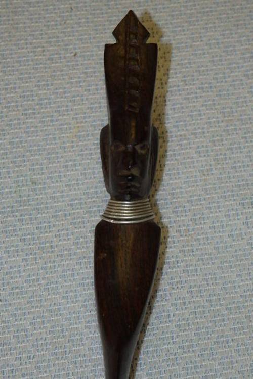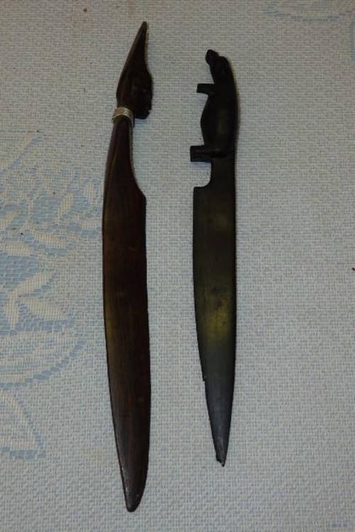 THESE TWO FANTASTIC HAND CARVED LETTER OPENERS INCLUDE A TEAK CARVED HEAD/ BUST (27.3cm LONG) AND A BLACKWOOD HIPPO (23cm LONG). THE LETTER OPENERS HAVE A LITTLE AGE AND USAGE RELATED WEAR, BUT THEY ARE STILL BOTH VERY NICE PIECES.