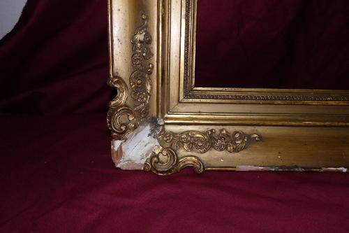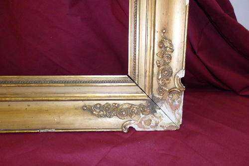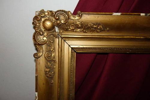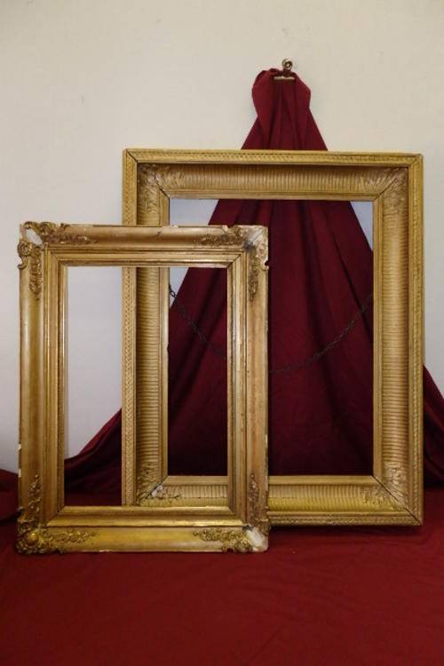 THESE TWO FANTASTIC "LARGE" ANTIQUE "GOLD" MOLDED SOLID WOODEN FRAMES ARE THE IDEAL RESTORATION PROJECT FOR A COLLECTOR. THESE ARE TWO REALLY BEAUTIFUL FRAMES AND MAGNIFICENT EXAMPLES OF THE FRAMES OF YESTERYEAR. THE LARGER OF THE TWO FRAMES MEASURES A VERY DECENT 79.5cm LONG x 64.5cm WIDE AND 8cm BROAD, AND THE SMALLER OF THE TWO MEASURES 65cm x 49.5cm AND IS JUST UNDER 5cm BROAD. PLEASE VIEW THE PICS CAREFULLY FOR THE GENERAL CONDITION OF THE FRAMES.